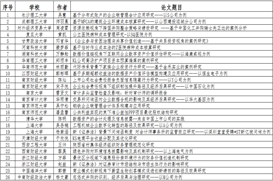 经MPAcc优秀学位论文组织委员会审议,《基于分布式账户的企业碳管理会计应用研究——以S公司为例》等26篇学位论文获得2023年MPAcc优秀学位论文奖;南京财经大学和南京师范大学获得2023年MPAcc优秀学位论文组织奖。