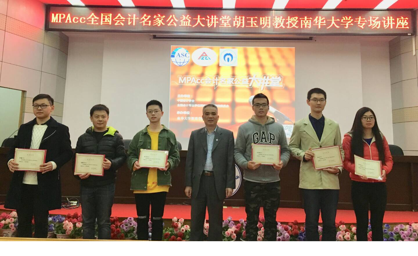 讲座之初,胡玉明教授向南华大学6名会计硕士研究生颁发“MPAcc会计名家公益大讲堂”助学金,以表彰该6名会计硕士研究生在学习、科研方面做出的突出表现。