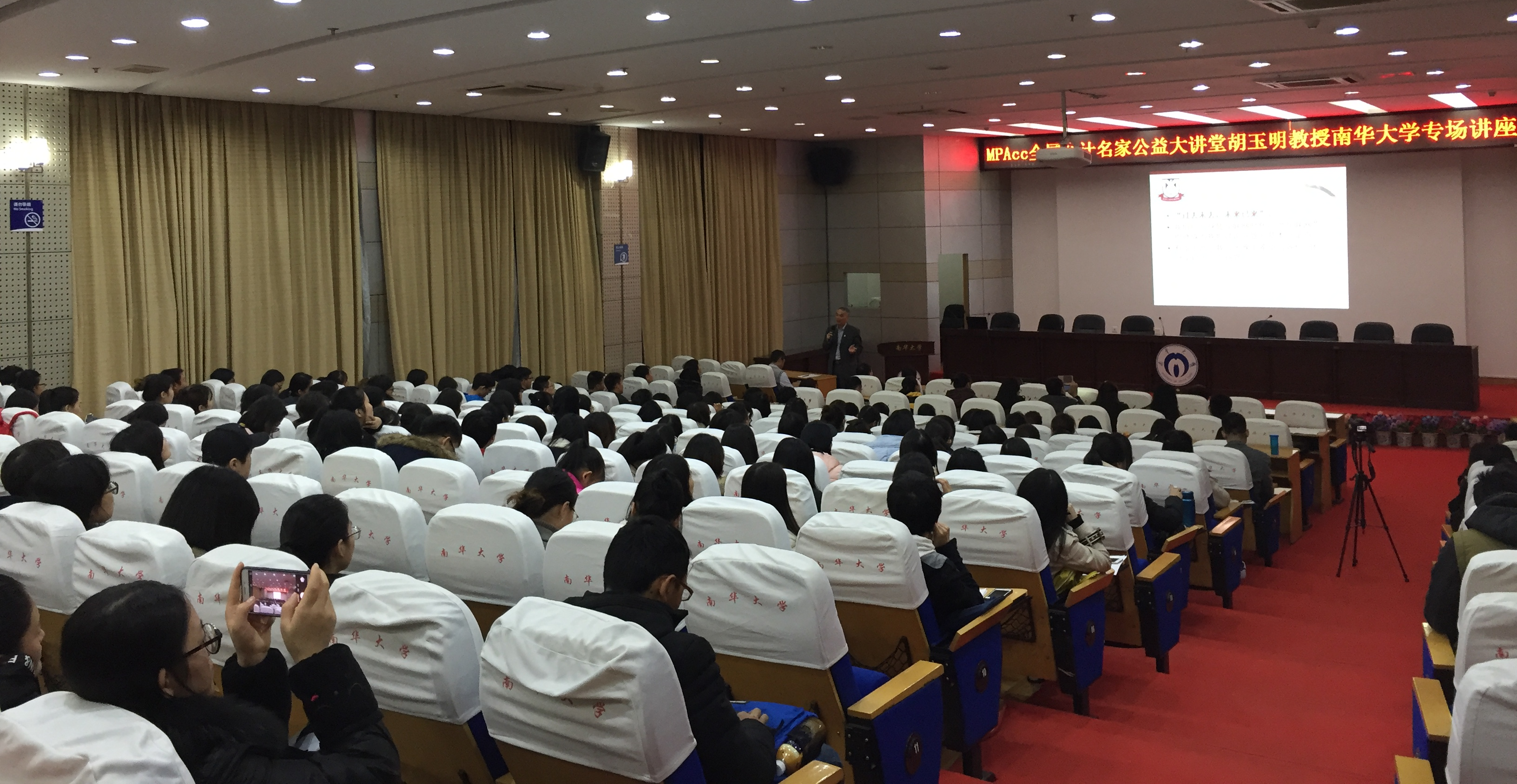 2017年12月2日,由中国会计学会、全国会计专业学位研究生教育指导委员会主办,南华大学管理学院承办的“MPAcc会计名家公益大讲堂”活动,在南华大学图书馆一楼学术报告厅隆重举行。暨南大学会计系胡玉明教授做了题为“管理会计的‘技’与‘道’”的演讲,150余位师生共同聆听了这场知识盛宴。本次活动由南华大学副校长雷小勇教授主持。