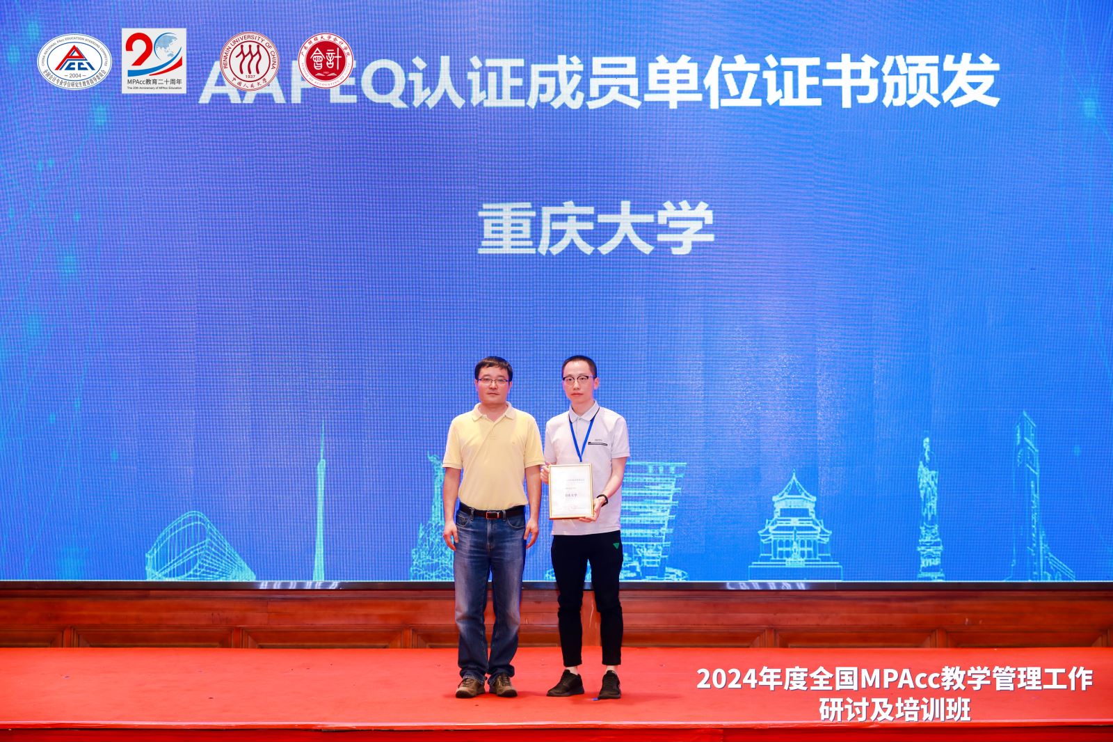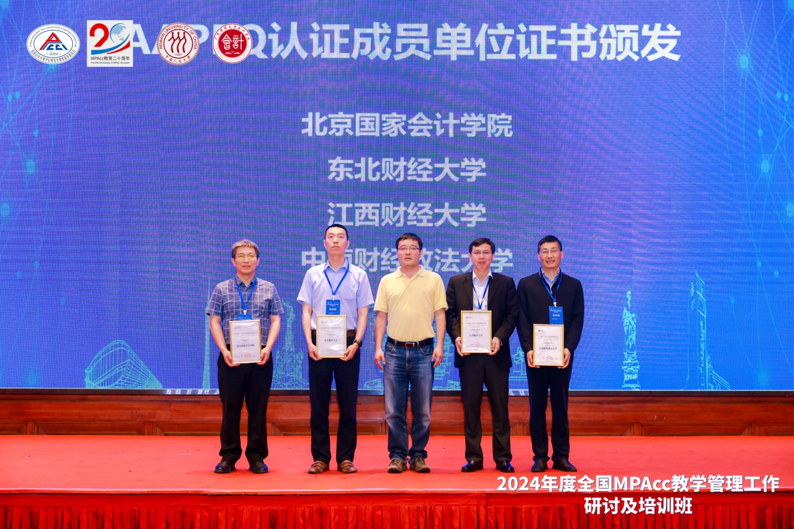 随后,支晓强教授为通过会计专业学位教育质量认证(AAPEQ)再认证的北京国家会计学院、东北财经大学、江西财经大学、中南财经政法大学以及首次通过AAPEQ认证的重庆大学颁发AAPEQ认证A级成员单位证书。