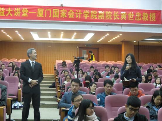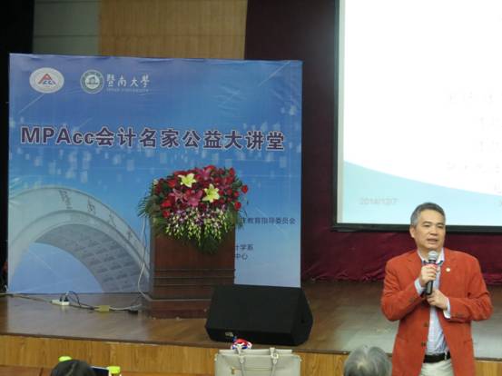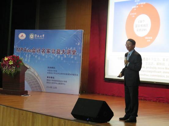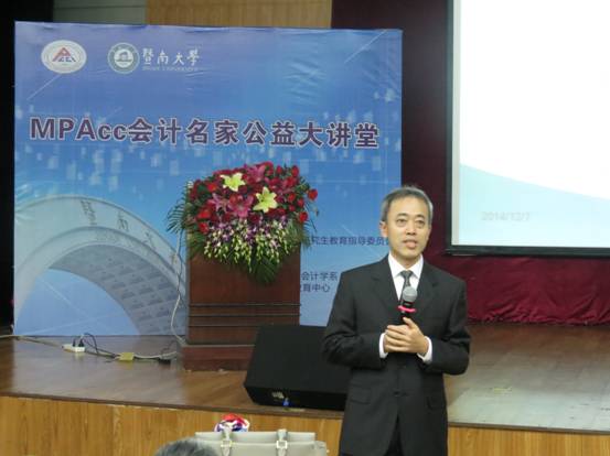 2014年12月7日,“MPAcc会计名家公益大讲堂”在暨南大学隆重举行,由全国会计专业学位研究生教育指导委员会委员、国际财务报告准则咨询委员会委员、厦门国家会计学院副院长、厦门大学会计系黄世忠教授主讲。