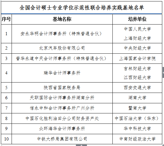 全国会计硕士专业学位示范性联合培养实践基地获选名单如下 :