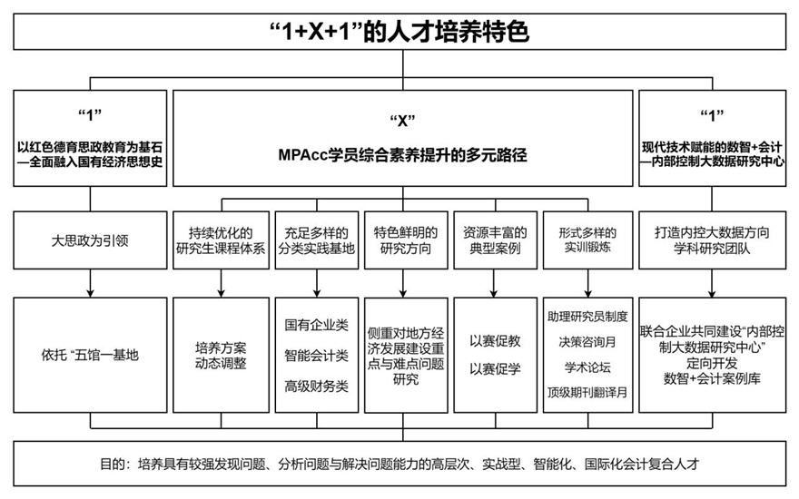 在服务经济发展人才培养方面,吉林财经大学作为一所具有77年办学历史的地方性财经院校,坚守为党和国家、为区域经济发展培育财经英才,累计培养输送了10万多名奋战在国家、经济建设主战场上的高素质专业人才。吉林财经大学MPAcc项目依托学校深厚历史底蕴,结合经济社会发展需求,确立了MPAcc培养的总体目标:立足于区域经济发展,在思政德育引领下实现“学术”与“实务”双翼展航,培养“高层次、实战型、智能化、国际化”会计复合人才。本项目构建了“1+X+1”的人才培养特色: