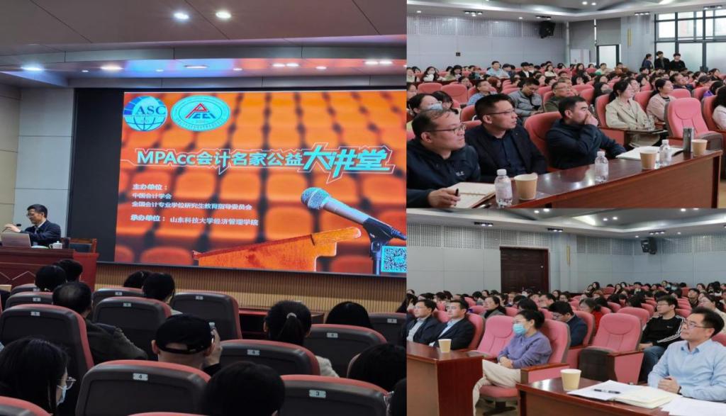 2024年4月23日下午3:00,MPAcc会计名家公益大讲堂在山东科技大学经济管理学院433报告厅开讲。本次大讲堂由中国会计学会、全国会计专业学位研究生教育指导委员会主办,山东科技大学经济管理学院承办。邀请教育部特聘教授、财政部首批“会计名家”、中国会计学会常务理事暨财务管理专业委员会副主任、全国会计专业学位研究生教育指导委员会副主任委员、国家社会科学基金学科规划评审专家、深交所会计专业咨询委员会委员、北京大学财务分析与投资理财研究中心主任、北京大学光华管理学院会计学博士生导师陆正飞教授来我院就《我国企业的过度负债与过度投资问题——公司治理视角的分析》为主题与广大师生进行分享和交流。此次公益大讲堂与会者包括山东科技大学经济管理学院党委理论学习中心组成员,财务处、科技产业管理处负责人和工作人员,经济管理学院教师、研究生、本科生及来自中国石油大学(华东)与青岛理工大学的师生,共200余位听众见证了这场学术盛宴。