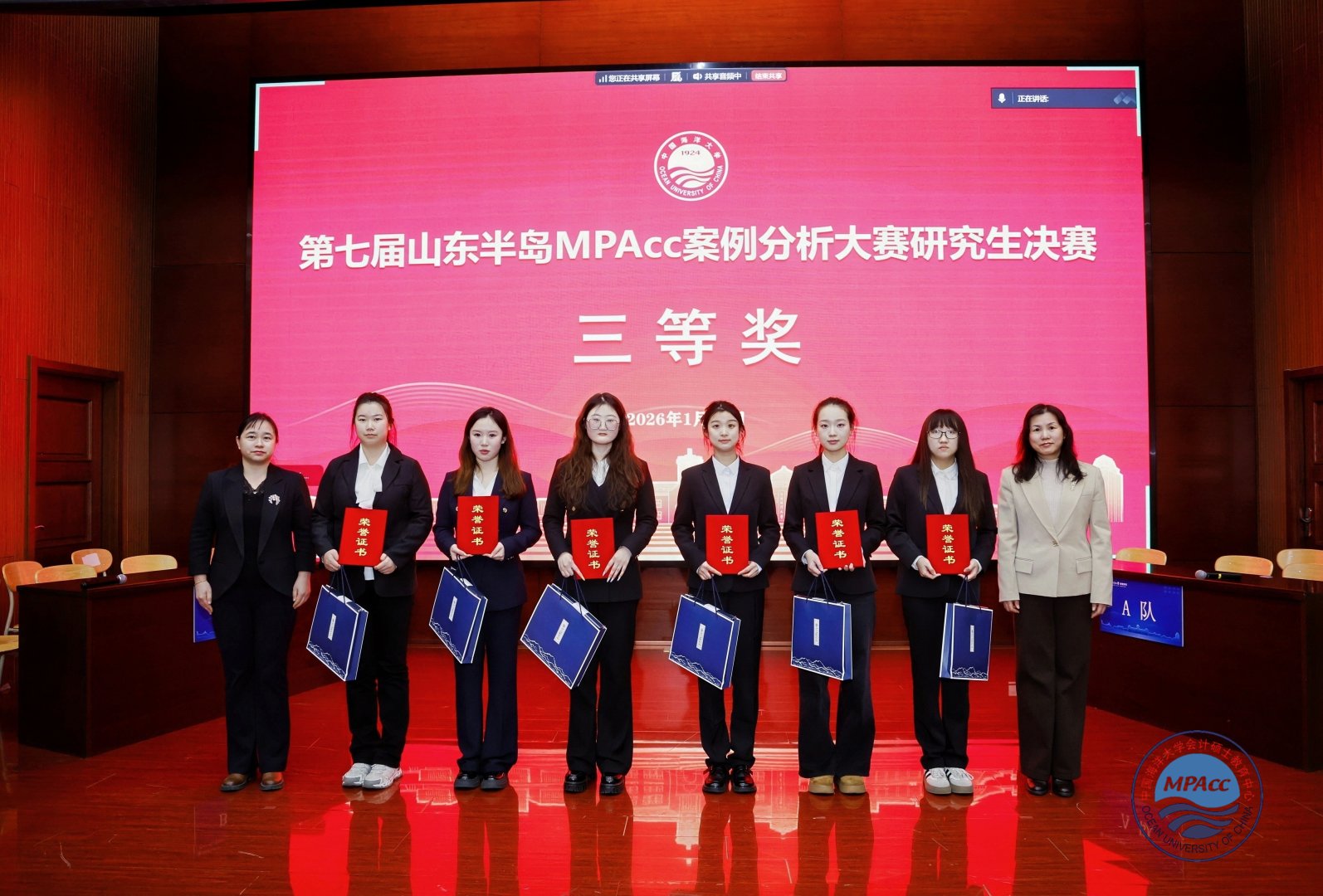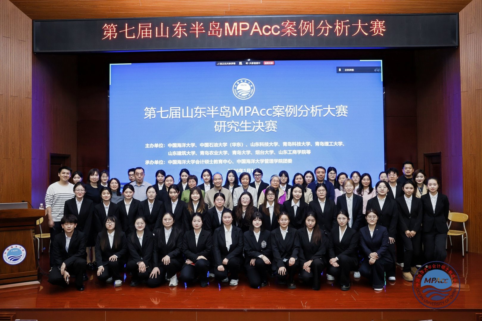 2026年1月18日,第七届山东半岛MPAcc案例分析大赛决赛在中国海洋大学(崂山校区)成功落幕。本项大赛由中国海洋大学、中国石油大学(华东)等10所高校联合主办,已成功举办七届。本次大赛吸引山东省内10所高校近260支队伍、1500余人参赛。经初赛、复赛层层选拔,最终8支本科生队伍与10支研究生队伍脱颖而出,晋级决赛。